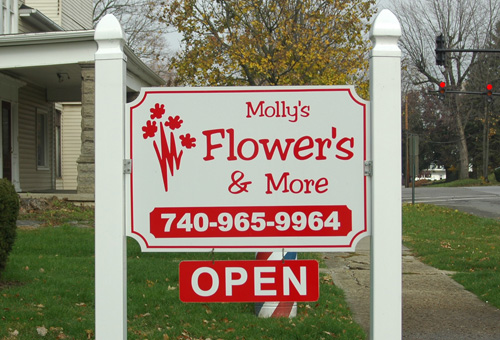 Molly’s sign is a two sided sign made from ½” thick PVC. This material comes in white and is a good choice for a smaller exterior sign. The graphics on this sign are cut vinyl. We use this material for signs that are no longer than 4’ wide and 3’ tall. The shape of this sign was routed on our CNC router. We can cut any shape sign blank that you would like. This material is solid all the way through so there is no need to protect the edges.